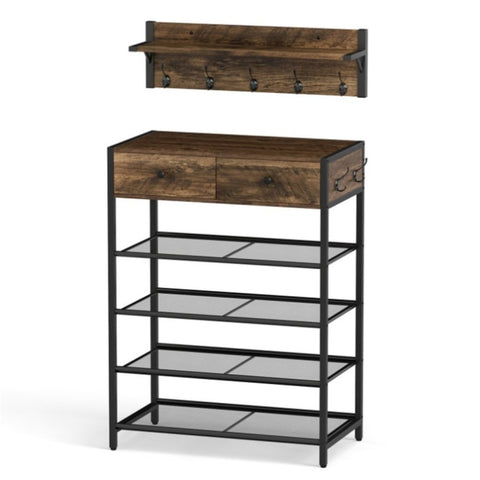 Multifunctional Entryway Storage - 5-Hook Coat Rack 2-Drawer Shoe Stand with 4 Mesh Shelves 31871415