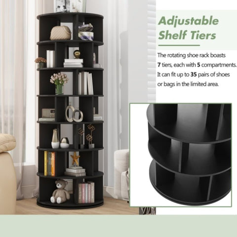 The rotating shoe rack boasts 7 tiers, each with 5 compartments. You can adjust the number of tiers according to your needs, thereby providing a flexible storage solution. It can fit up to 35 pairs of shoes or bags in the limited area.