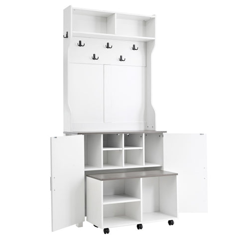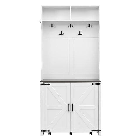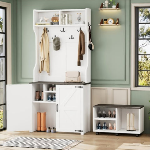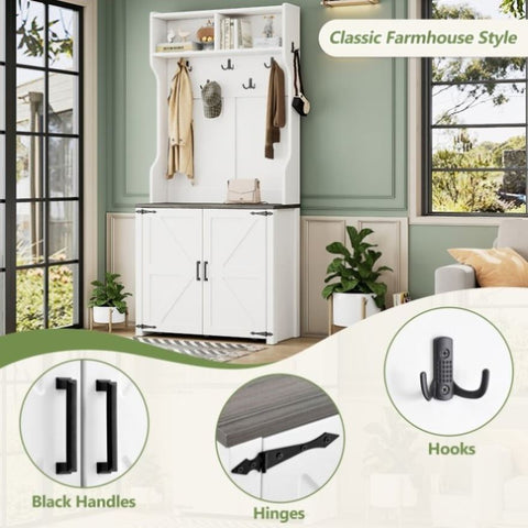 ON-TREND Farmhouse 4-in-1 Hall Tree with Barn Doors, Movable Bench with 7 Hanging Hooks and Shoe N721P205788K