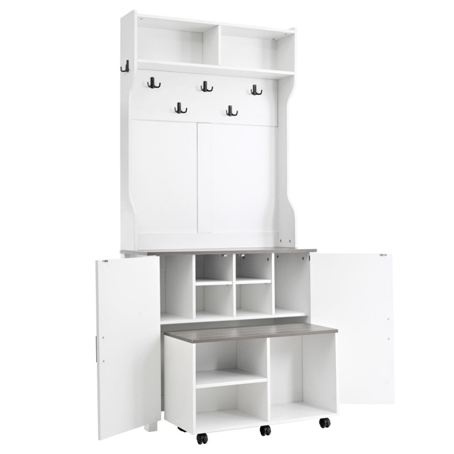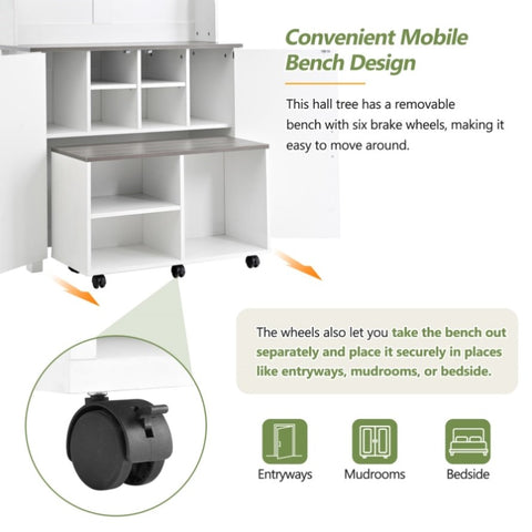 Integrating coat rack, shoe cabinet, hanging hooks and seating bench, this hall tree offers a complete organization system for your entryway or hallway. No matter where it is placed, with this all-in-one furniture piece, you can meet a variety of storage needs in one compact design.