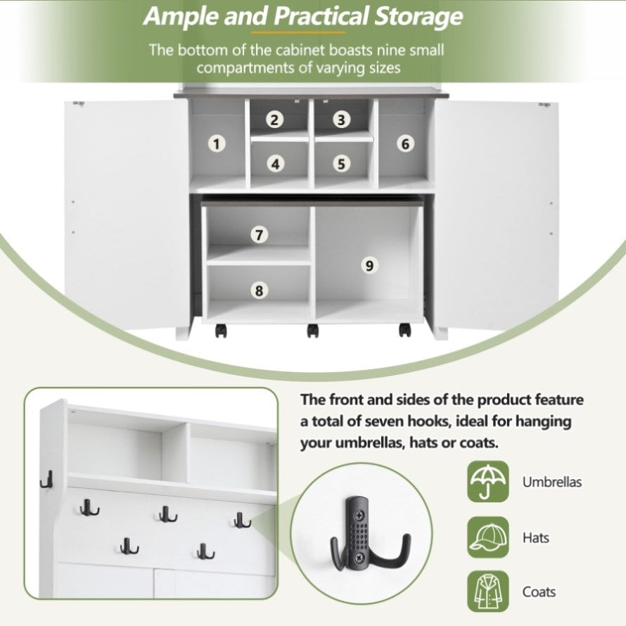The bottom of the cabinet boasts nine small compartments of varying sizes, effortlessly accommodating shoes or clutters of different dimensions. The front and sides of the product feature a total of seven hooks, ideal for hanging your umbrellas, hats or coats. It offers versatile storage options for your belongings, presenting you with a tidy entryway.