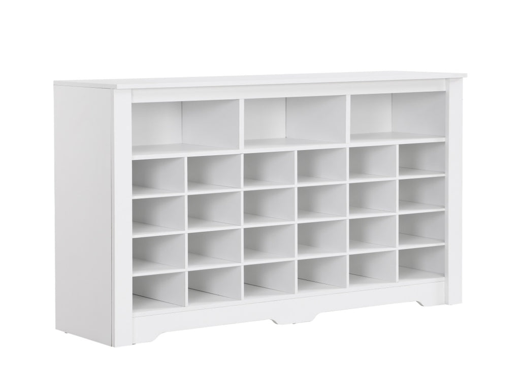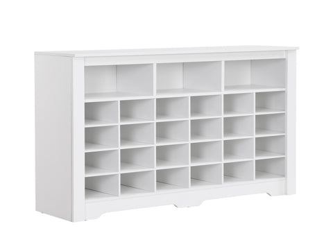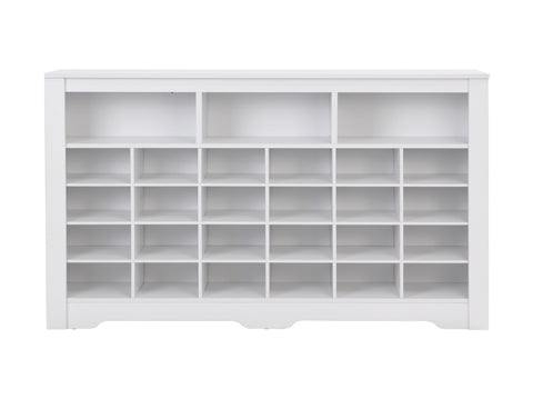 The cabinet is divided into 24 small cubbies, each designed to hold a single pair of shoes, ensuring that your shoes are neatly organized and easily accessible. The upper 3 sections provides additional space for larger items such as boots or other items.