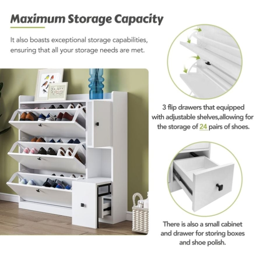 It also boasts exceptional storage capabilities with 3 flip drawers that equipped with adjustable shelves, allowing for the storage of 24 pairs of shoes. There is also a small cabinet and drawer for storing boxes and shoe polish, ensuring that all your storage needs are met.