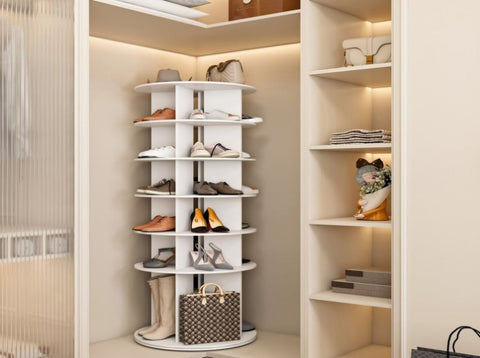 ORGANIZED AND BEAUTIFUL - Make your shoes neat and organized with this rotating shoe rack tower lazy susan; The space saving design can hold up many shoes or bags in a compact space; SIZE: 23.7"W x 23.7"D x 63.4"H