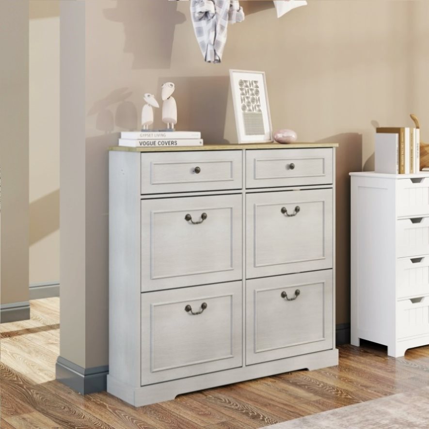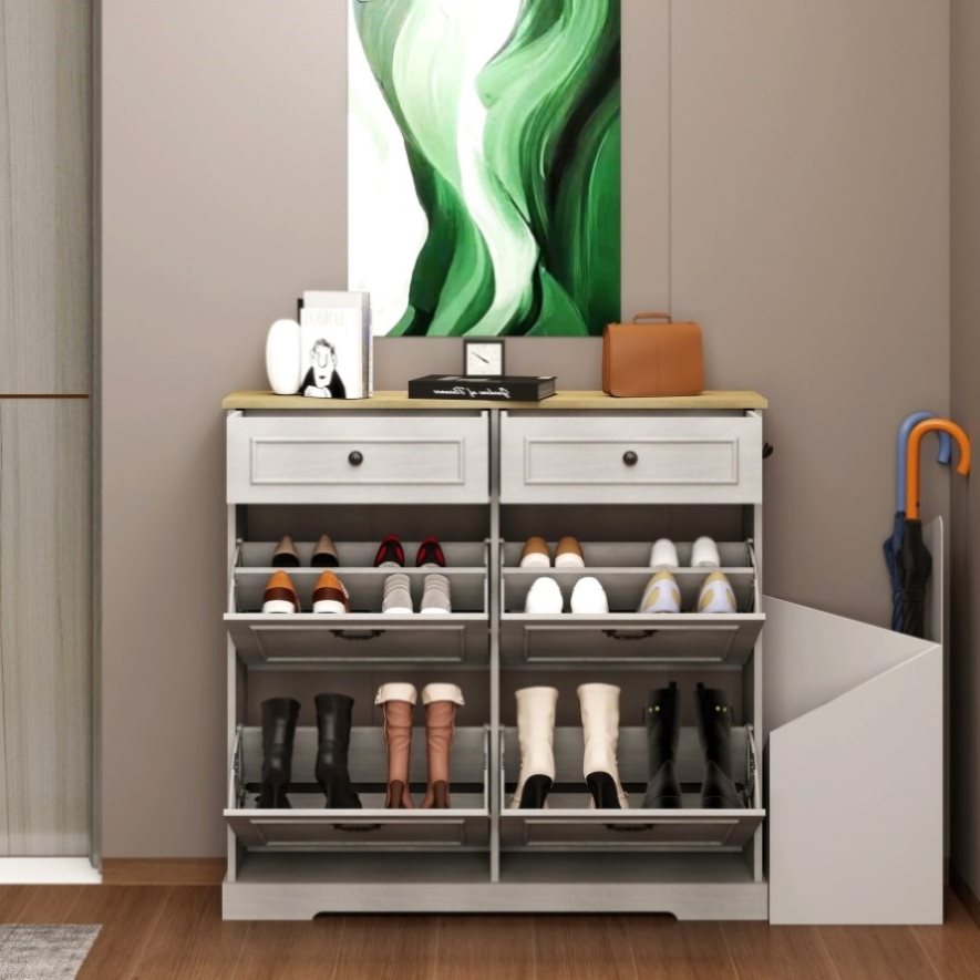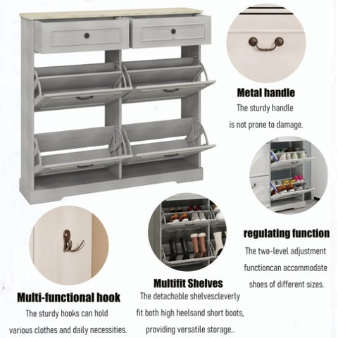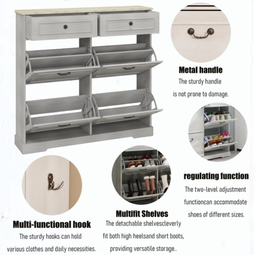 Large Capacity:The entry shoe cabinet provides 4 flip-top drawers, each drawer contains two levels of storage space, providing you with ample space to store shoes and other home decorations. The shelves can be adjusted into two grooves or removed to accommodate different heights and sizes of flats, mid-boots or heels.There are also 2 drawers on the top for storing your door keys, wallet, and other miscellaneous items for easy access at the door.The hook on the side can meet your needs.