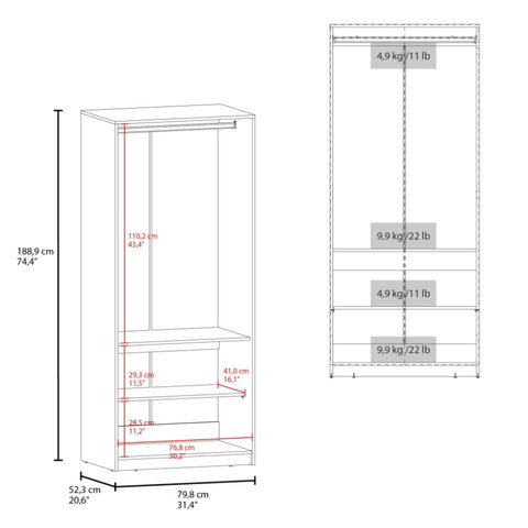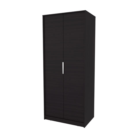 "Maximize your storage space with this elegant two-door wardrobe. Its vertical, compact design is perfect for small rooms or limited spaces, offering a practical and organized solution to store clothing, shoes, and accessories. It features a top hanging rod for garments, two spacious shelves for boxes, folded clothes, or personal items, and a bottom space ideal for shoes or larger objects. The metal handles add a modern and functional touch, while its sleek finish allows it to blend seamlessly with any décor style. Materials: Particle board and Melamine Dimensions: 74.4"" (H) x 31.4"" (W) x 20.6"" (D)."""