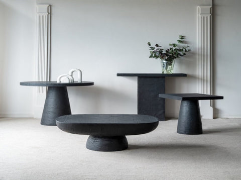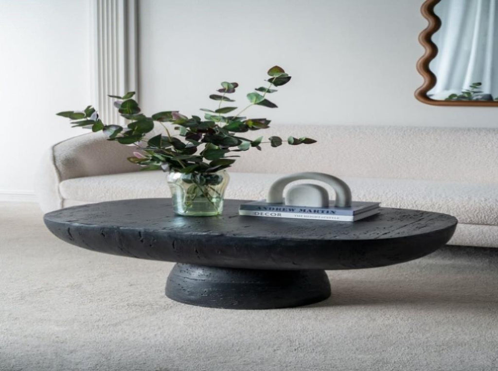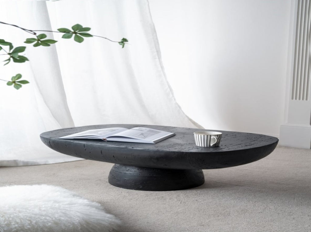 Proudly showcasing the elegant beauty of earthy minimalism, this coffee table boasts a bold black finish, a spacious oval top, and a round pedestal base that begs to be admired while providing versatile function.