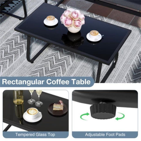 ● Elegant & Practical Table: Included is the patio furniture set is a rectangular coffee table, equipped with a tempered glass top to infuse a stylish touch. The table provides ample space for your drinks, snacks, or favorite magazines, rendering your items easily accessible.