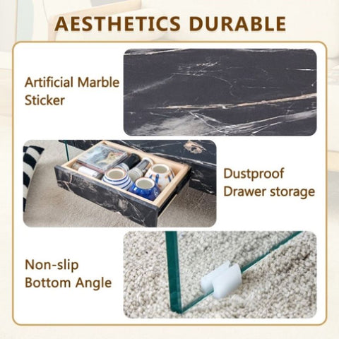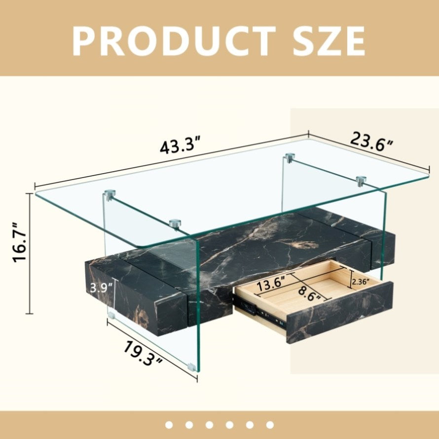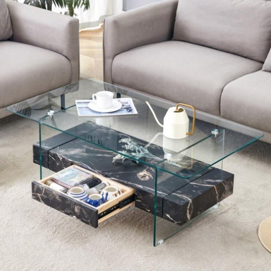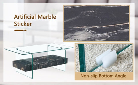 Double layer design: This coffee table adopts a double-layer design, with a transparent tempered glass top and a modern appearance. The lower layer is covered with black marble texture stickers on medium density fiberboard, adding an elegant feeling.