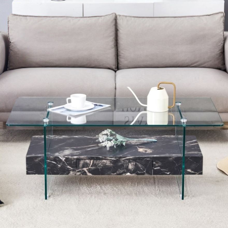 43.3 Inch Modern Two-Tier Coffee Table - Clear Tempered Glass and Black Marble Texture, W1151P232637