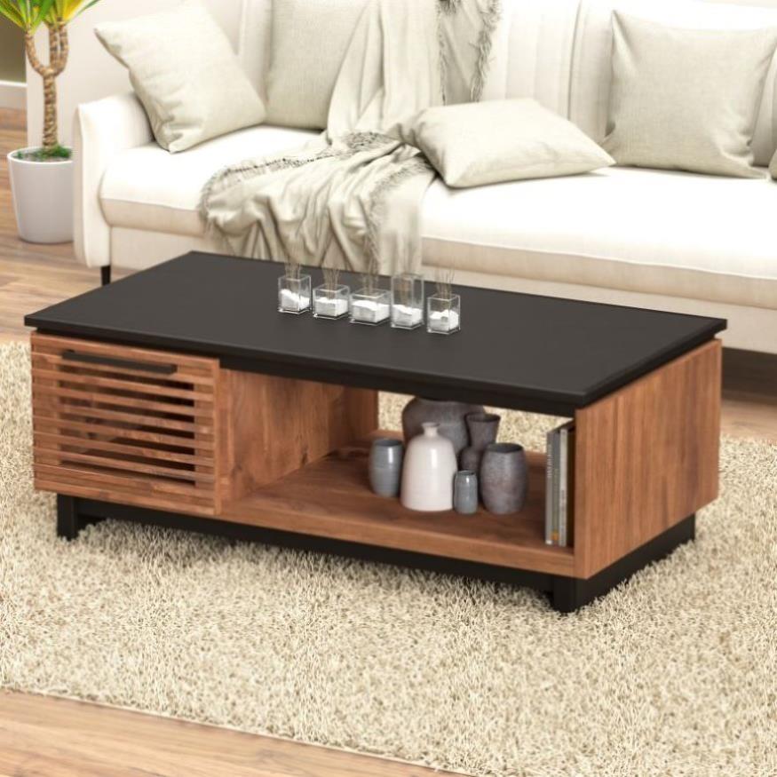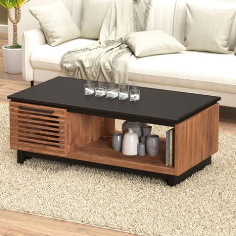 Bring home this 47 inch coffee table for a sophisticated and upscale addition to your home. This distinctive cocktail table is Scandinavian-inspired and artfully crafted from Poplar solids and Okume veneers with a two-tone Bourbon and Black finish. Featuring two doors with horizontal slat details, concealed storage and one lower shelf, this showstopping piece boasts clean, glamorous, mid-century style and unparalleled craftsmanship. Fully assembled upon arrival, this piece is ready to unbox and enjoy.