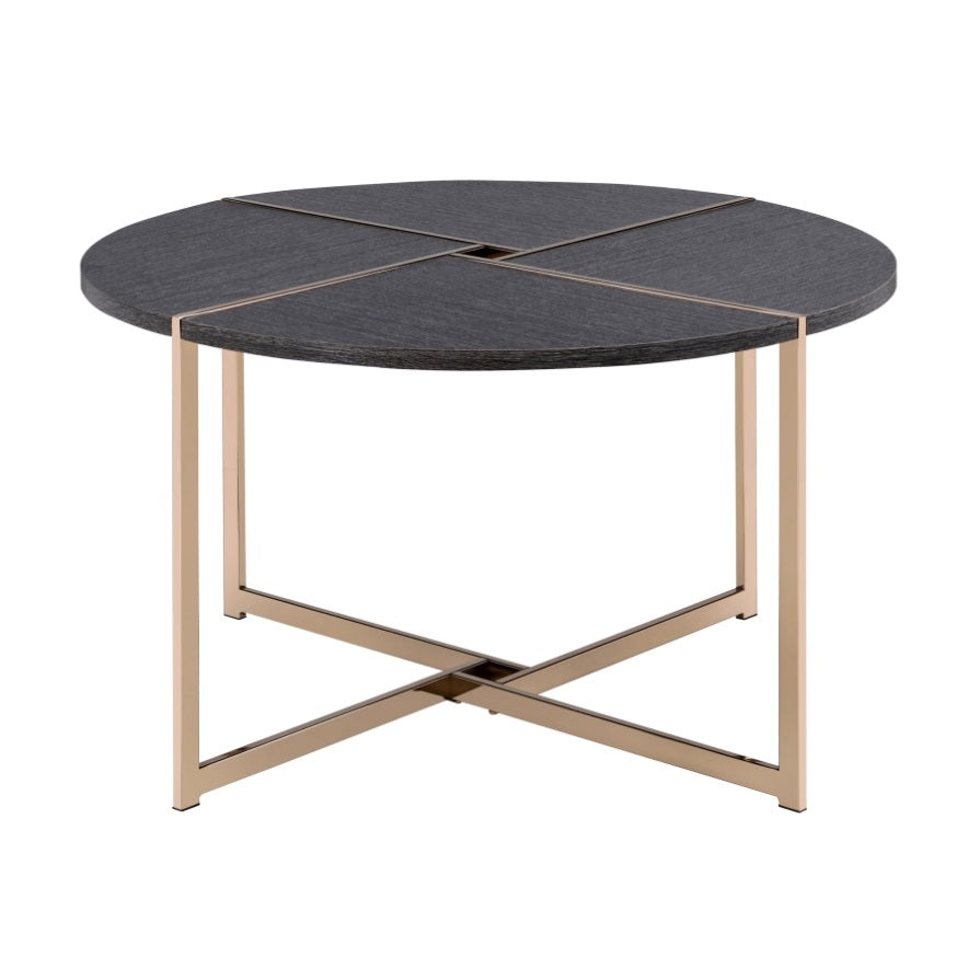 Champagne finished metal frame and black tabletop offer a versatile look that complements any decor style