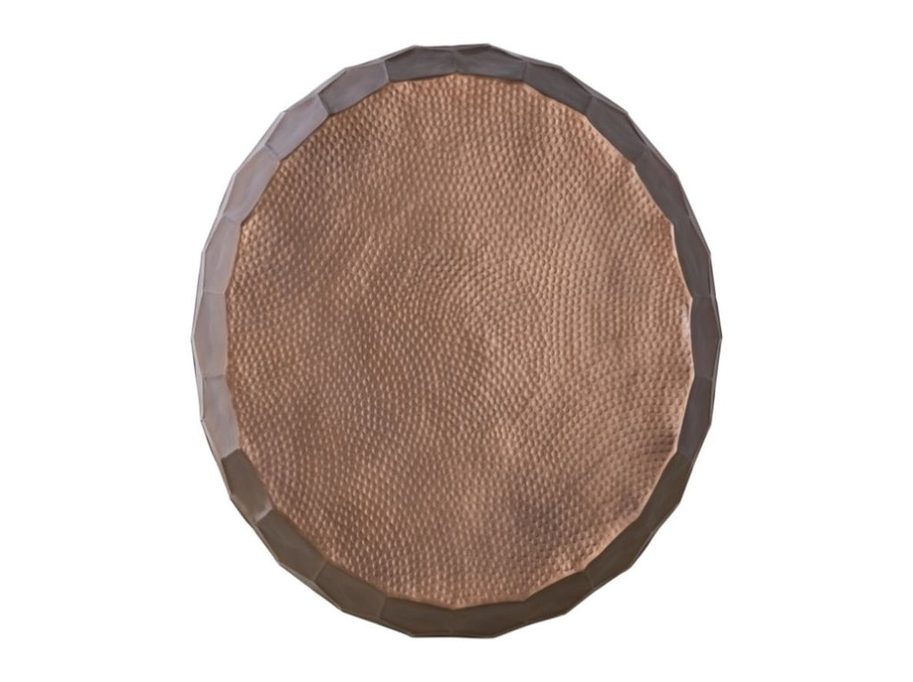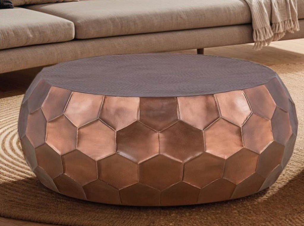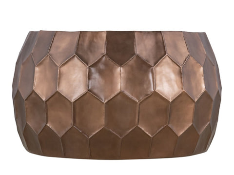 This stunning coffee table combines a hand-hammered design with a choice of three luxurious finishes: antique copper, antique silver, or antique bronze. The intricate, hexagonal pattern on its surface adds texture and visual interest, while its rounded shape brings a modern yet timeless appeal. Perfect for creating a focal point in your living space, this table offers both beauty and functionality with its artisanal craftsmanship and versatile color options.