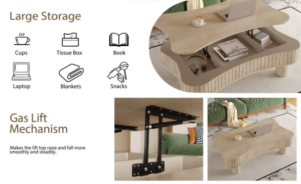 Premium Lifting Design: Give your living room a new look with the dual function of this lift-up coffee table. The smooth hydraulic lift instantly creates a workspace or lounge area while maintaining elegant storage underneath. It's perfect for small space living without sacrificing style.