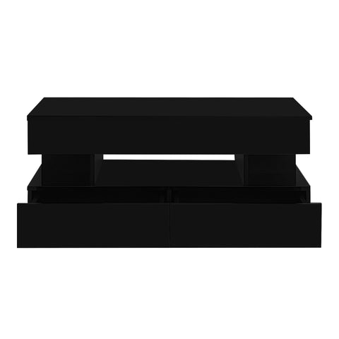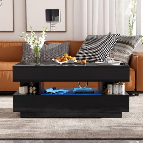 This coffee table combines style and functionality. Its minimalist black design suits any decor, from modern to industrial. The scalable structure adjusts to your needs, expanding for gatherings. Two drawers offer ample storage for keeping clutter at bay. Moreover, 16 - color LED strips illuminate the lower space, creating a cozy, mood - setting ambiance. Sturdy materials ensure long - lasting stability, making it a perfect addition to your living space.
