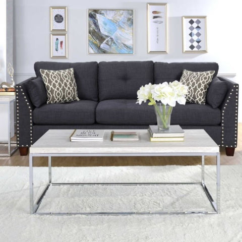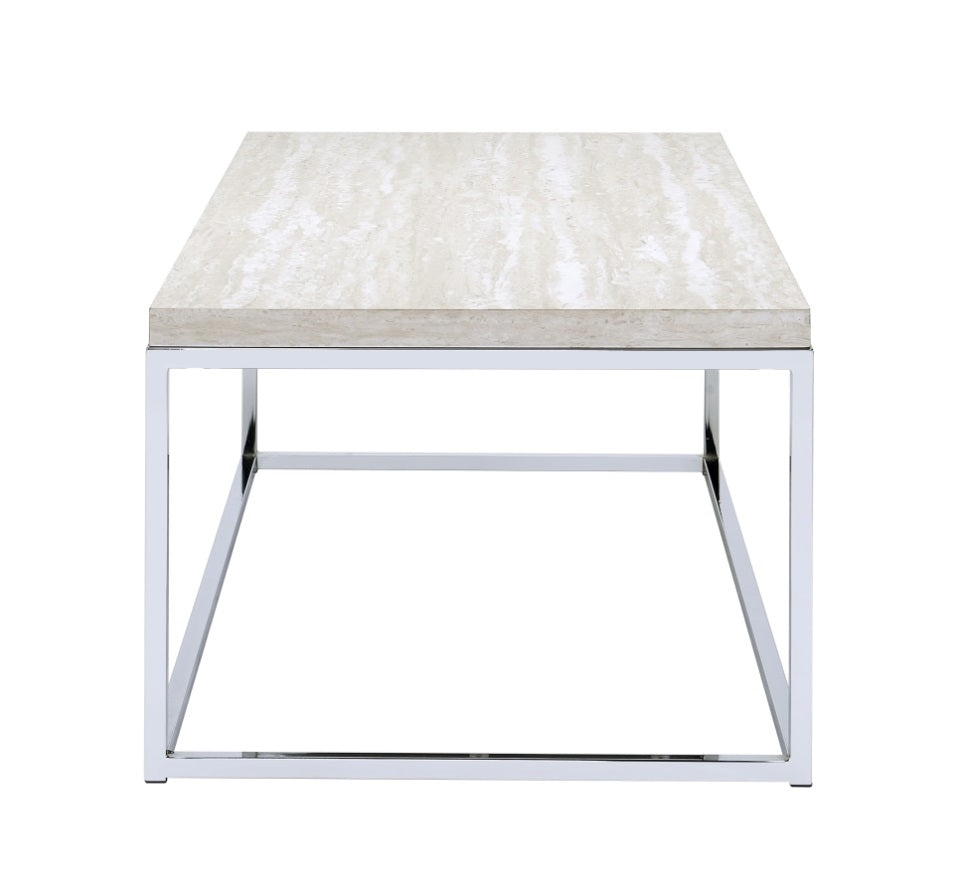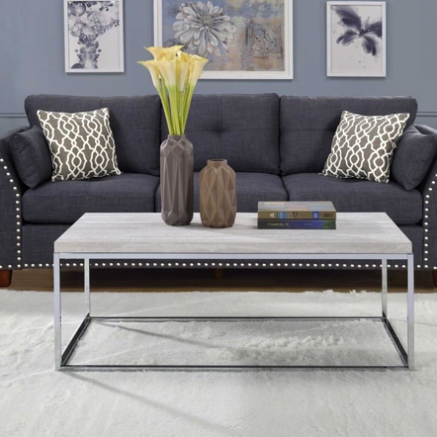 This stylish coffee table features a knock-down design for easy assembly and convenient transportation, making it suitable for various room settings and configurations. Designed in a rectangular shape with a sled base, it combines modern aesthetics with stability, supported by a chrome-finished metal sled base that ensures durability while adding a touch of elegance and a polished appearance to complement various interior styles.