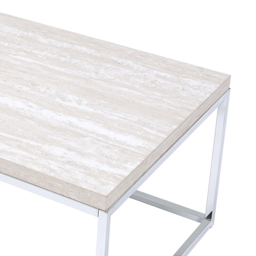 Supported by a metal sled base with a chrome finish, the table ensures stability and adds a touch of elegance, complementing various interior styles with its modern and polished appearance