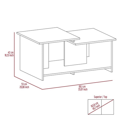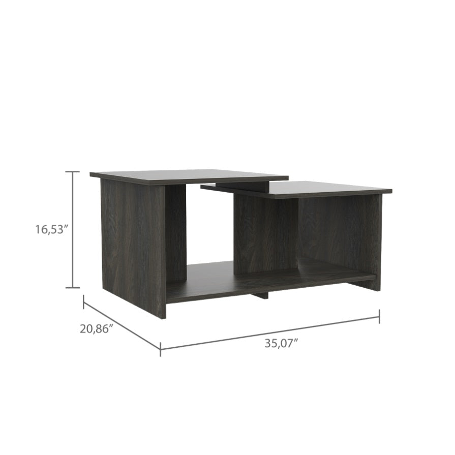 This contemporary black coffee table features a tiered tabletop and a full lower shelf, providing ample space for decor or storage. With a sleek black wenge finish and durable all-metal hinges, it elegantly displays books, picture frames, or tall decor while ensuring strong assembly.