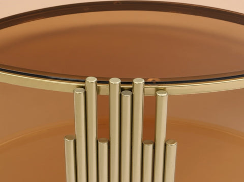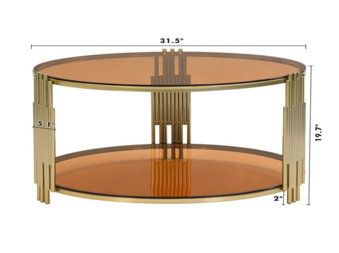 Circular Metal Drum Base: The coffee table is supported by a circular metal drum base with a gold finish. The base provides stability and a luxurious contrast to the brown glass top, enhancing the table's overall style.