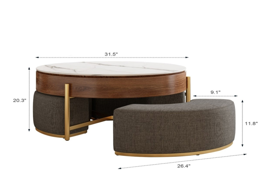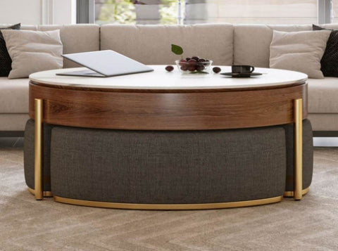 Elevate your living space with this modern lift-top round coffee table, designed for both style and functionality. Crafted with a walnut veneer body and a sleek sintered stone tabletop, this piece brings a touch of elegance to any room. The unique bridge-style tripod base ensures stability, while the lift-top feature reveals a hidden storage compartment—perfect for keeping your essentials organized. Accompanying the table are three upholstered ottomans, which seamlessly tuck underneath when not in use, saving space while offering extra seating. Whether for a cozy coffee break, work-from-home setup, or social gatherings, this versatile coffee table adapts to your needs effortlessly.