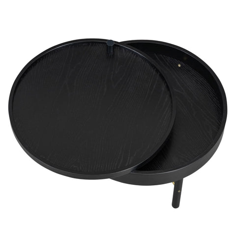 Modern Round Wood Rotating Tray Coffee Table with Storage & Metal Legs in Black