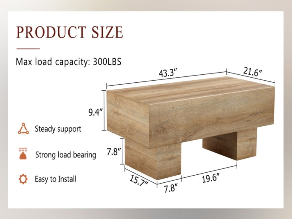 Light Wood Texture: The coffee table is made of MDF material with a light wood texture sticker, bringing a natural and warm wooden appearance.MDF Support Legs: Sturdy MDF support legs match the table top material and create a cohesive style.