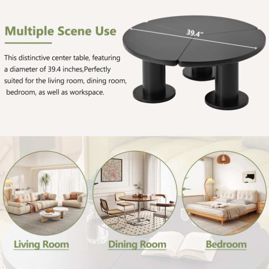 This distinctive center table, featuring a diameter of 39.4 inches, boasts a sleek and minimalist design that seamlessly integrates into various environments. Perfectly suited for the living room, dining room, bedroom, as well as workspace.