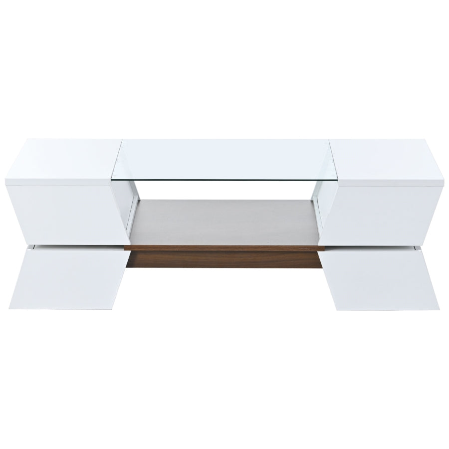 This coffee table features a geometric style that gives any room unique charm. The glass top highlights the open shelf in the middle of the table, creating an eye-catching display space.