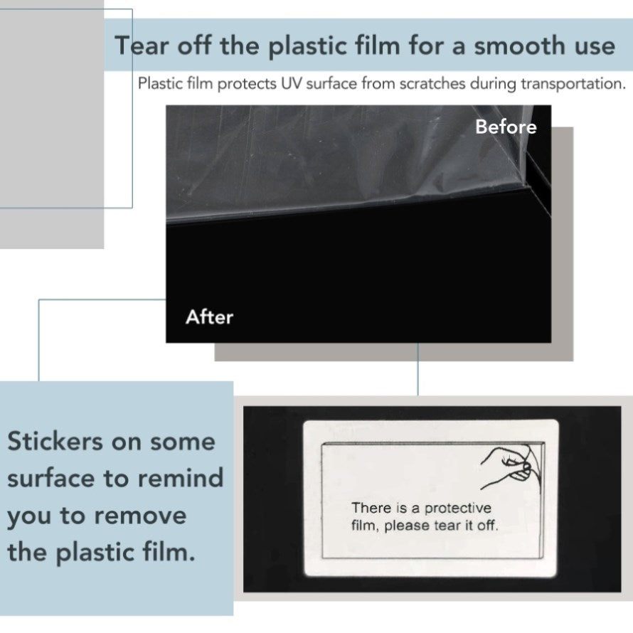 | Notice | The plastic film for protecting UV from scratches should be teared off before put into use. If there is light dust on the edge, it can be wiped with a wet rag. |