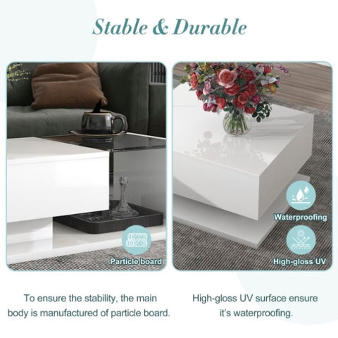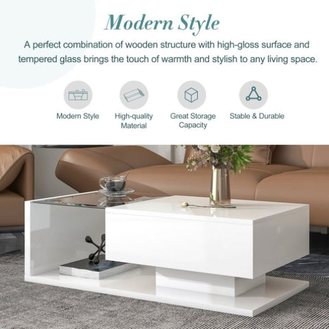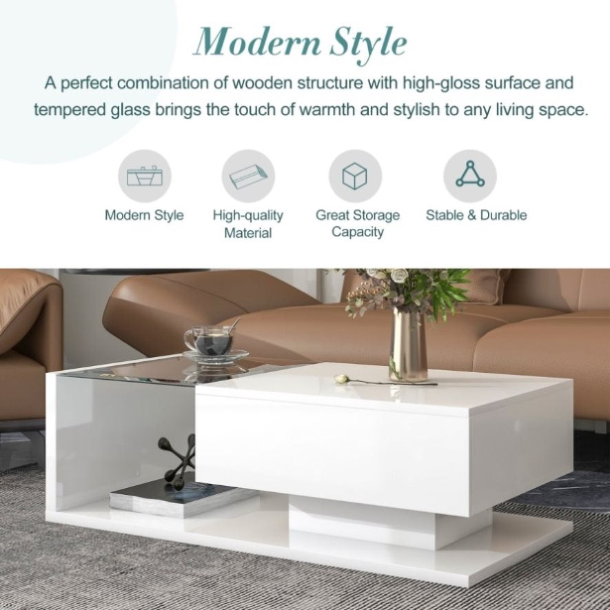 A perfect combination of wooden structure with high-gloss surface and tempered glass brings the touch of warmth and stylish to any living space.
