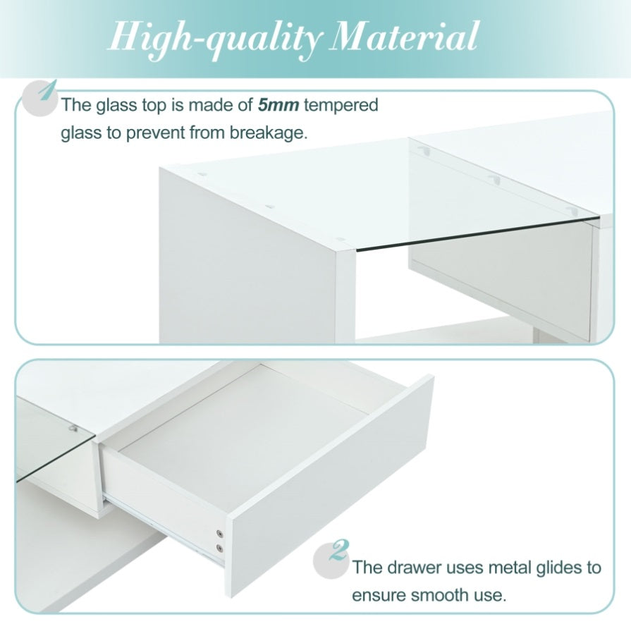 The glass top is made of 5mm tempered glass to prevent from breakage. The drawer uses metal glides to ensure smooth use.