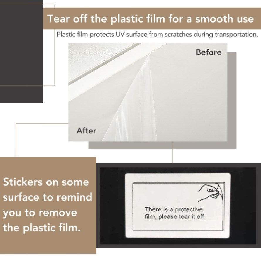 | Notice | The plastic film for protecting UV from scratches should be teared off before put into use. If there is light dust on the edge, it can be wiped with a wet rag. |