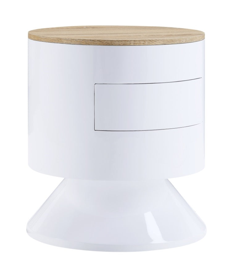 This stylish accent table combines display and utility functions with its sleek, round design in a glossy white finish.