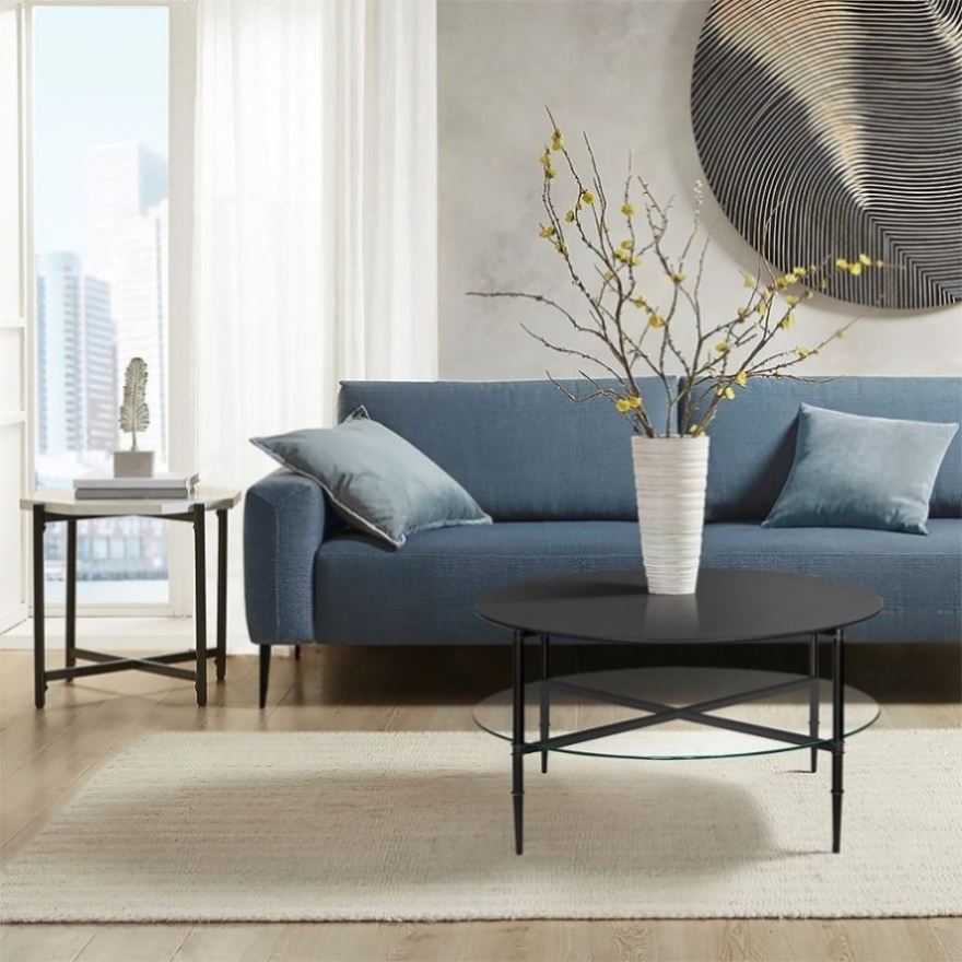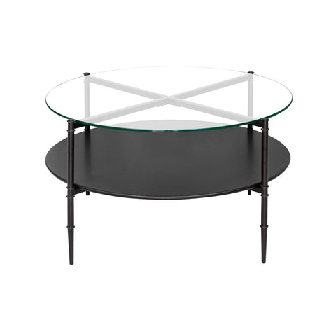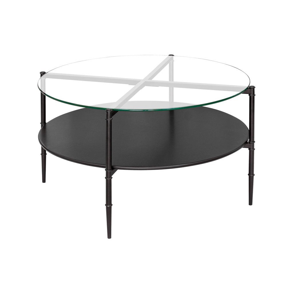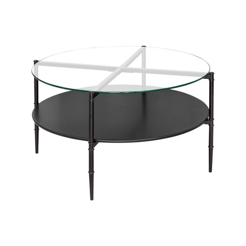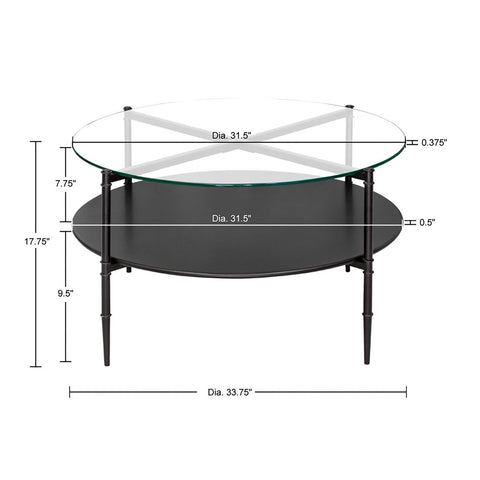 The Martha Stewart Caroline Round Coffee Table with Interchangeable Wood and Glass Top offers a bold and eye-catching centerpiece for your living room. This round coffee table features a clear tempered glass table top and lower wood shelf, for a chic modern look. The Glass and Wood tops are interchangeable to create two distinct contemporary looks. Complete with a matte black metal frame, this glass top coffee table brings a refined touch to elevate your living space. Assembly is required, tools are included.