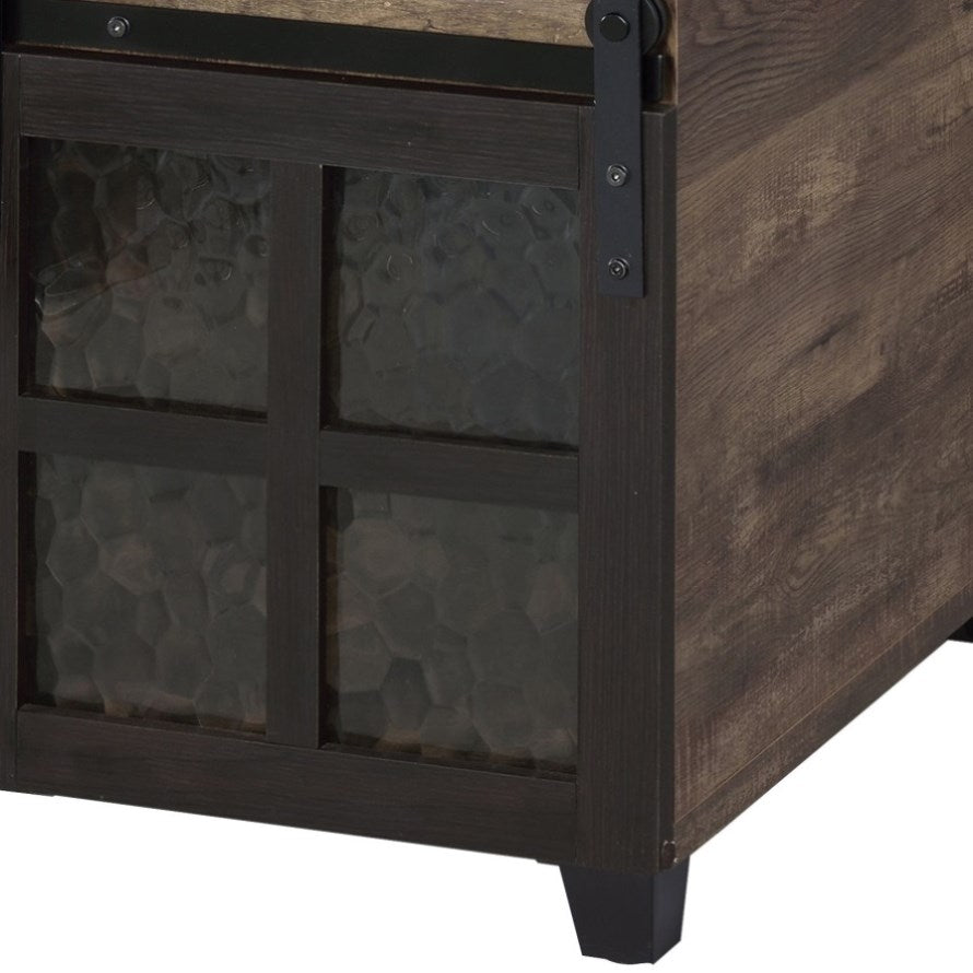 The coffee table features two glass sliding barn doors that offer both privacy and style. Behind each door, there’s a storage compartment, freeing up tabletop space.