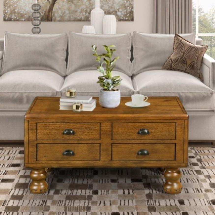 Solid Wood Rectangle Coffee Table for Living Room, 40-Inch Antique Coffee Table with 4 Drawers, Wood W1202P176741
