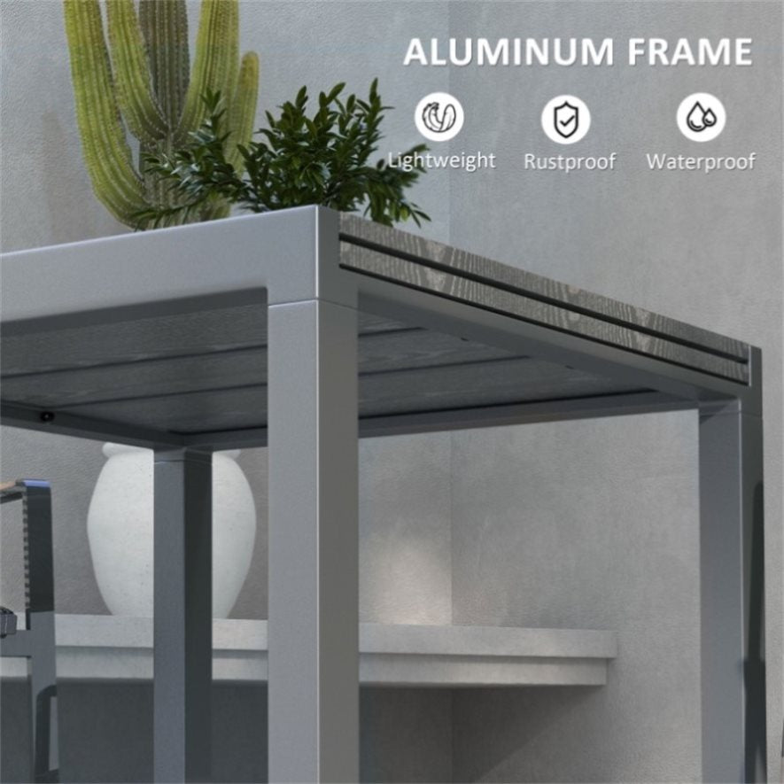 - - Features an aluminum frame and metal plate with a wood-effect top