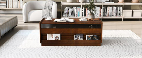 This elegant vintage-inspired rectangular coffee table is the perfect blend of aesthetics and functionality. With its ample storage space, stylish design, and high-quality materials, it offers a timeless charm that will complement any interior. The four drawers, glass accents, and grooved details create a harmonious balance between vintage and modern design elements, making it a standout piece in any room.Investing in this coffee table means bringing both beauty and practicality into your home. Whether you place it in your living room, bedroom, or dining area, it promises to not only elevate your decor but also provide a functional solution for organizing your space. This coffee table will undoubtedly become a beloved focal point in your home for years to come.