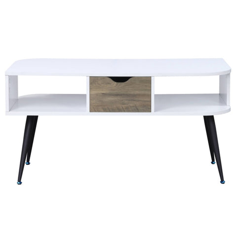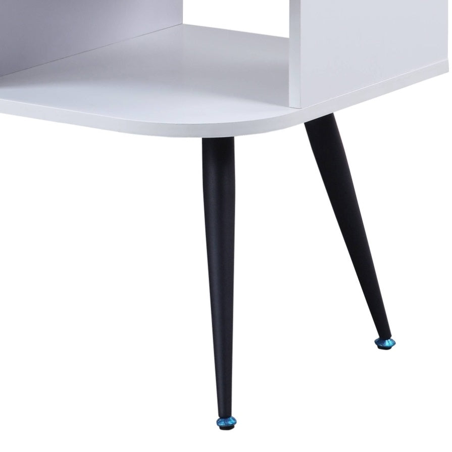 This contemporary end table offers a clutter-free solution with a convenient drawer for storing remote controls, magazines, or other small items, complemented by two open compartments perfect for displaying books or decor. Its metal legs, coated with durable powder, provide both style and resilience, ensuring a sleek, modern look that stands the test of time.
