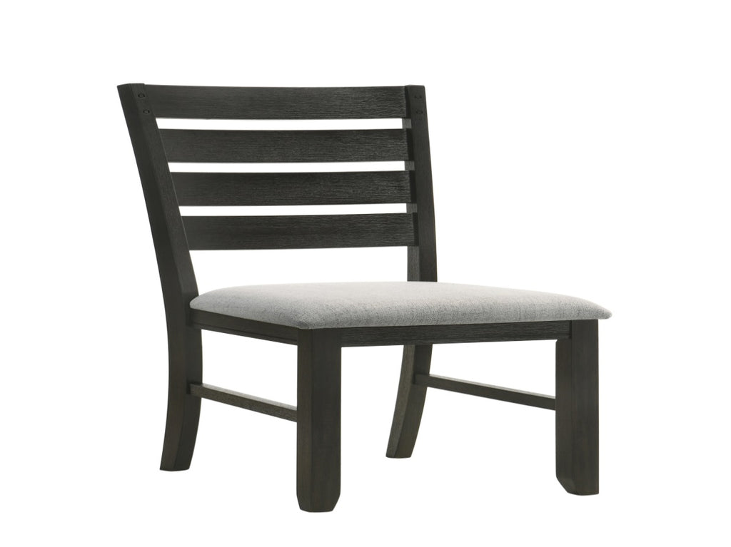 Description :- This dining side chair with gray fabric upholstered seat adds contemporary style and comfort. Use the chair at either of the two choices of rectangular dining table. The smooth, ladder back style backrest completes the sleek look of the chair..