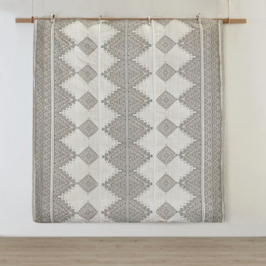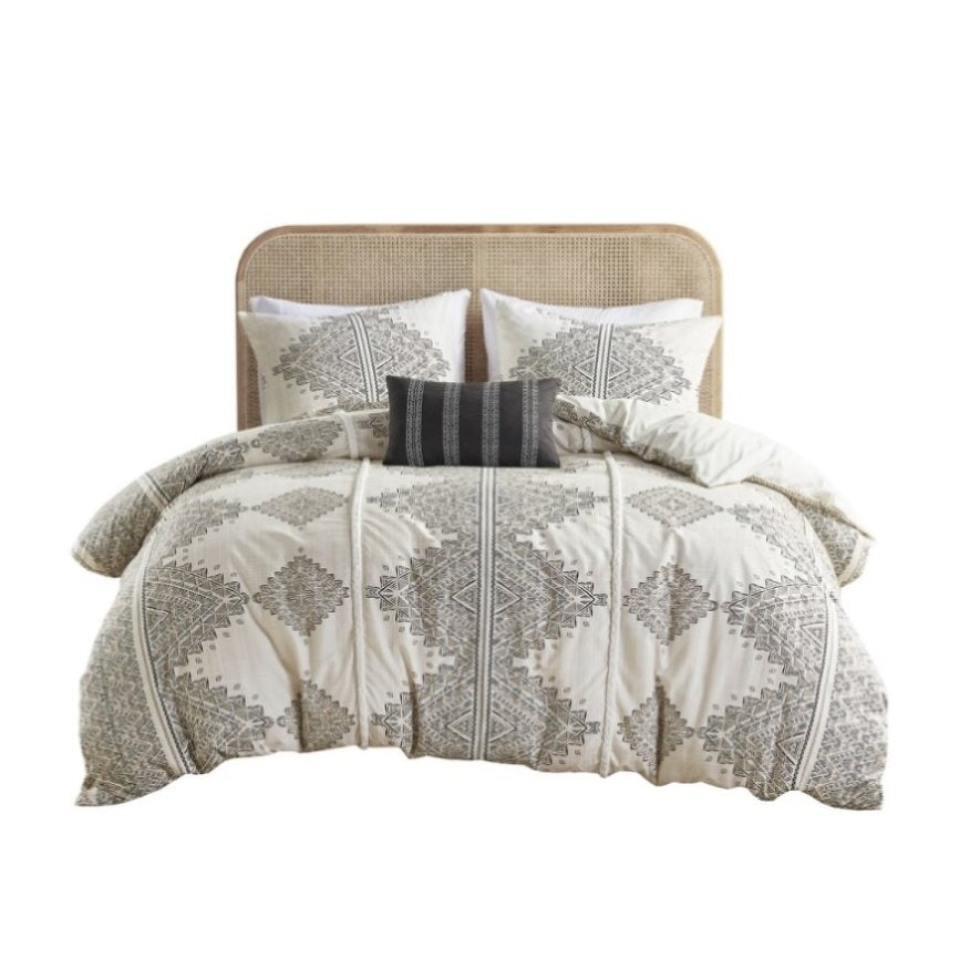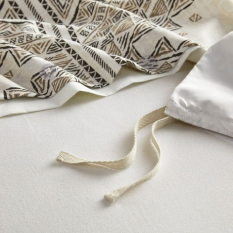 This soft microfiber artisan duvet cover set displays a printed global inspired design, perfect for chic boho bedroom. Featuring small triangular shapes and lines that when formed together depicts larger geometric shapes and stripes on top of a beige and ivory background. Two white chenille trim at the center of the bed adds dimension to the set while the dark throw pillow adds contrasts. Colors featured in this set include various shade black, brown, tan, and grey. Our duvet covers come with button closures and 4 inner ties to help keep your duvet insert secured (inserts sold separately). This bedding set is also OEKO-TEX certified and machine washable for easy care.