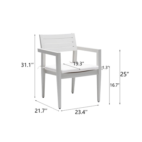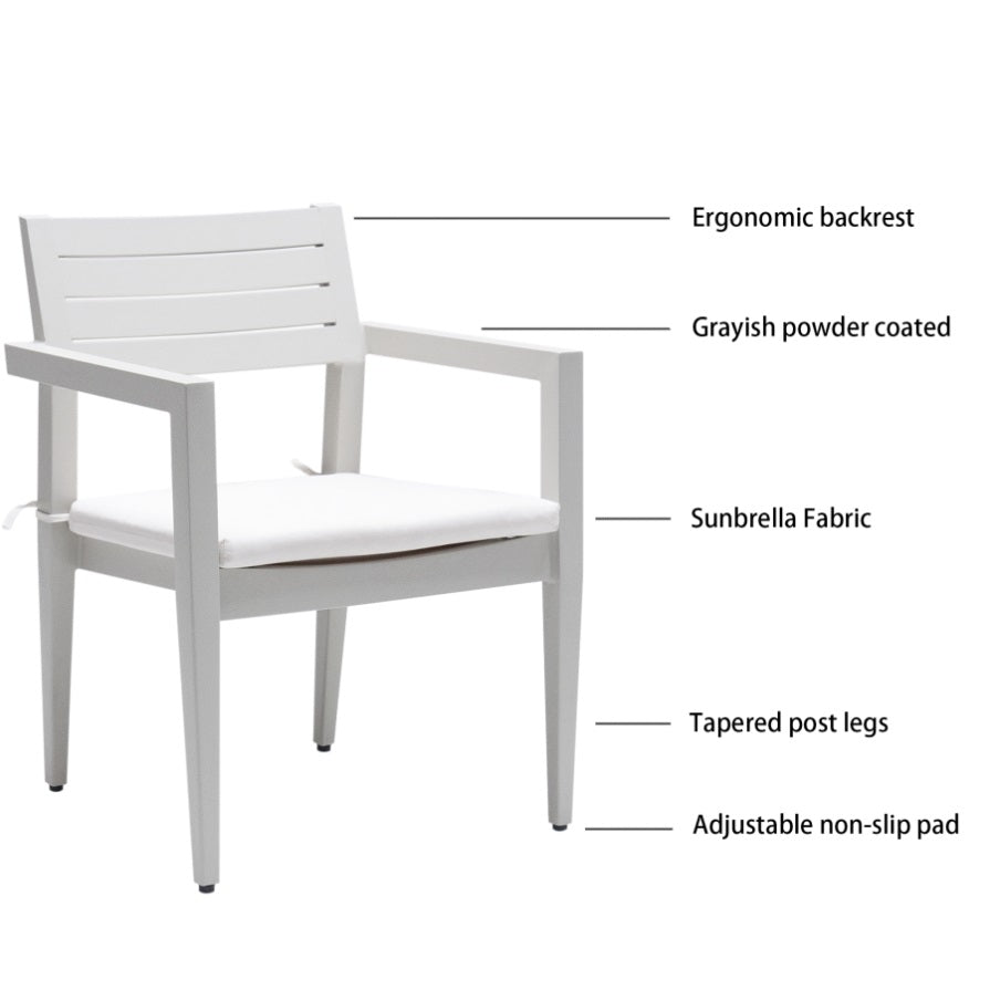 This contemporary aluminum dining set features a sleek design that is perfect for your home. The 40" x 70" rectangular table top is crafted from durable aluminum and finished in a stylish Matte White. The table frame is finished in a Grayish powder coat for a contrasting look that is both stylish and durable. This unique dual-tone powder coating is a hallmark of this product. The chairs feature a tapered design that complements the table and provide a comfortable seating experience. The chairs are also made from aluminum and are finished in the same Grayish powder coat as the table frame. The chairs have Sunbrella fabric cushions that are UV resistant and easy to clean. This dining set is perfect for both indoor and outdoor use. The aluminum construction is weather-resistant and will not rust or fade, even in harsh weather conditions. The Sunbrella fabric cushions are also weather-resistant and will not fade or mildew.