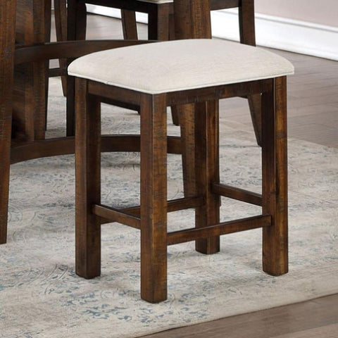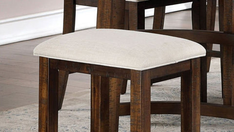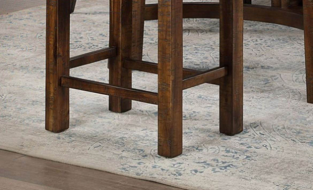 With its earthly rustic oak finish, this counter set is the epitome of barnyard design excellence. The solid wood stool features a frame with beautiful wood grain patterns. It shares the same finish as the rest of the set but with a slight twist--the fabric cushion is in a light beige shade, designed with welts to spruce up the clean and crisp silhouettes of the set.