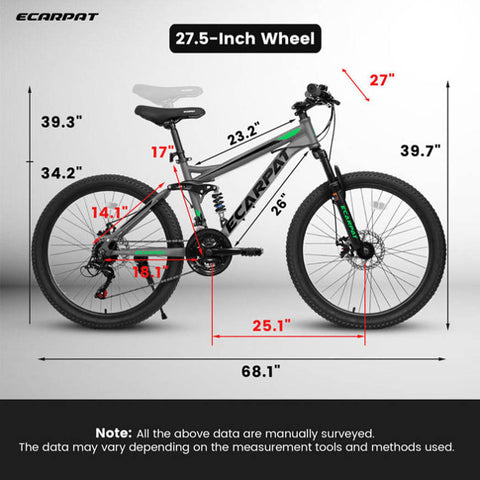 【Full Suspension Design for a Comfortable Ride】This mountain bike features front and rear dual shock absorbers that effectively absorb bumps on rough terrains, providing a smooth and comfortable riding experience suitable for various terrains.
