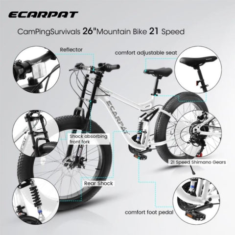4 INCH FAT TIREWidth up to 4 inches, 5 times more wear resistance than ordinary bicycle tires. Strong grip and anti-skid, fully able to challenge any terrain, conquer any off-road trails and urban roads.