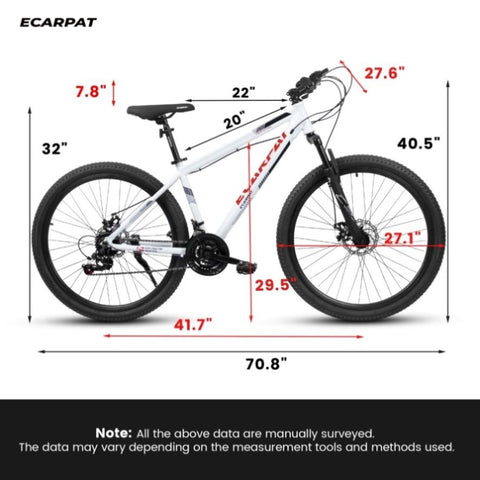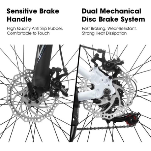 Brake&ShifterFront and rear disc brakes ensure timely and effective braking,provide you better durability and stopping power for your rugged and damp adventures.The 21-speed drivetrain with Shimano shifters and Trigger Shifter allows you to find the most comfortable and efficient gear for the kind of road.