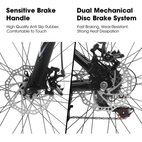 Brake&ShifterFront and rear disc brakes ensure timely and effective braking,provide you better durability and stopping power for your rugged and damp adventures.The 21-speed drivetrain with Shimano shifters and Trigger Shifter allows you to find the most comfortable and efficient gear for the kind of road.