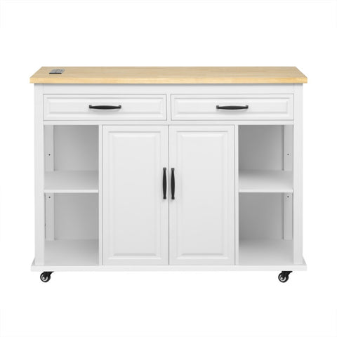 - [Upgraded Built-in Outlet]This exquisitely crafted kitchen island boasts a sophisticated built-in charging station, complete with 2 AC outlets, 1 USB port, and 1 Type-C port to accommodate all of your kitchen appliance power needs. You can conveniently charge your coffee maker, juicer, and any devices that use Type-C ports of this kitchen storage island. Whether you're using it as an additional workspace,or a casual dining spot, the island's versatile design caters to various kitchen activities.