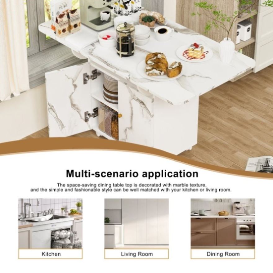 Space-saving folding table with storage space: The table can be folded into a small cabinet, and there are storage layers and drawers to store kitchenware, drinks or daily items such as snacks, paper towels, etc.
