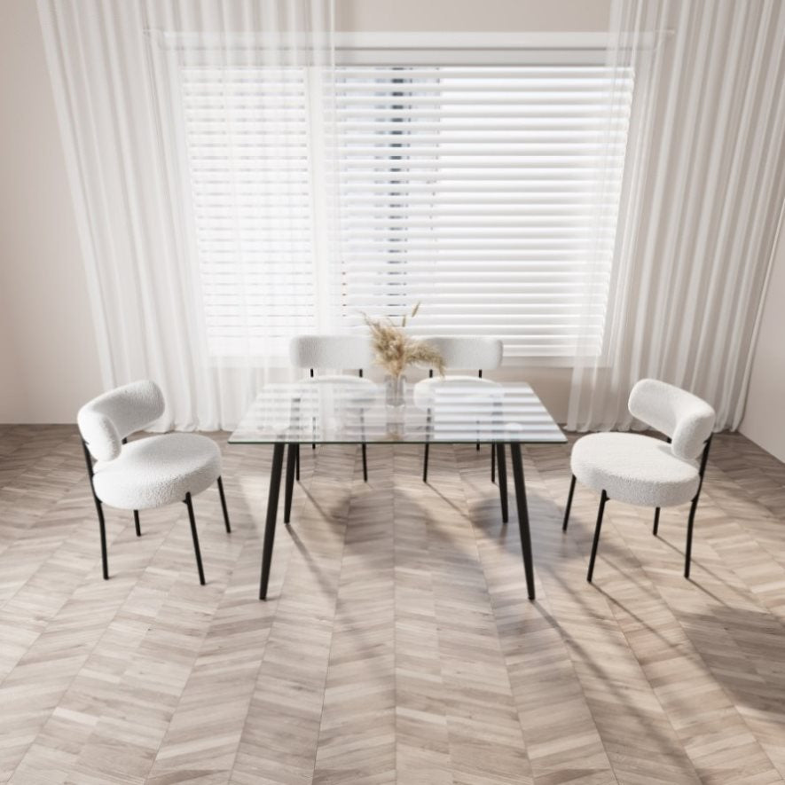 2.Glass Dining Table: Elevate your dining space with our glass dining table, boasting a sleek design with four Black metal legs that seamlessly combine style and stability.